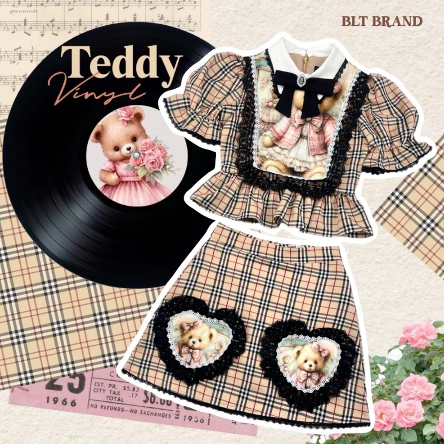 BLT BRAND ชุดเซ็ท 2 ชิ้น เสื้อ+กระโปรง ลายสก็อแขนตุ๊กตาลายน้องหมี ดีเทลสวยทั้งชุด ใส่ไปเที่ยว ออกงาน คาเฟ่