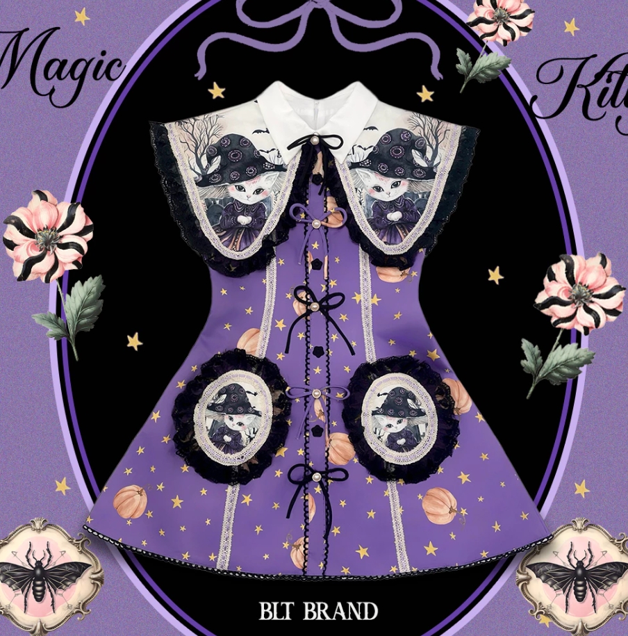 BLT BRAND ชุดเดรสพิมพ์ลายธีมฮาโลวีนสีม่วงสุดคิ้วท์ ตกแต่งโบว์สุดน่ารัก