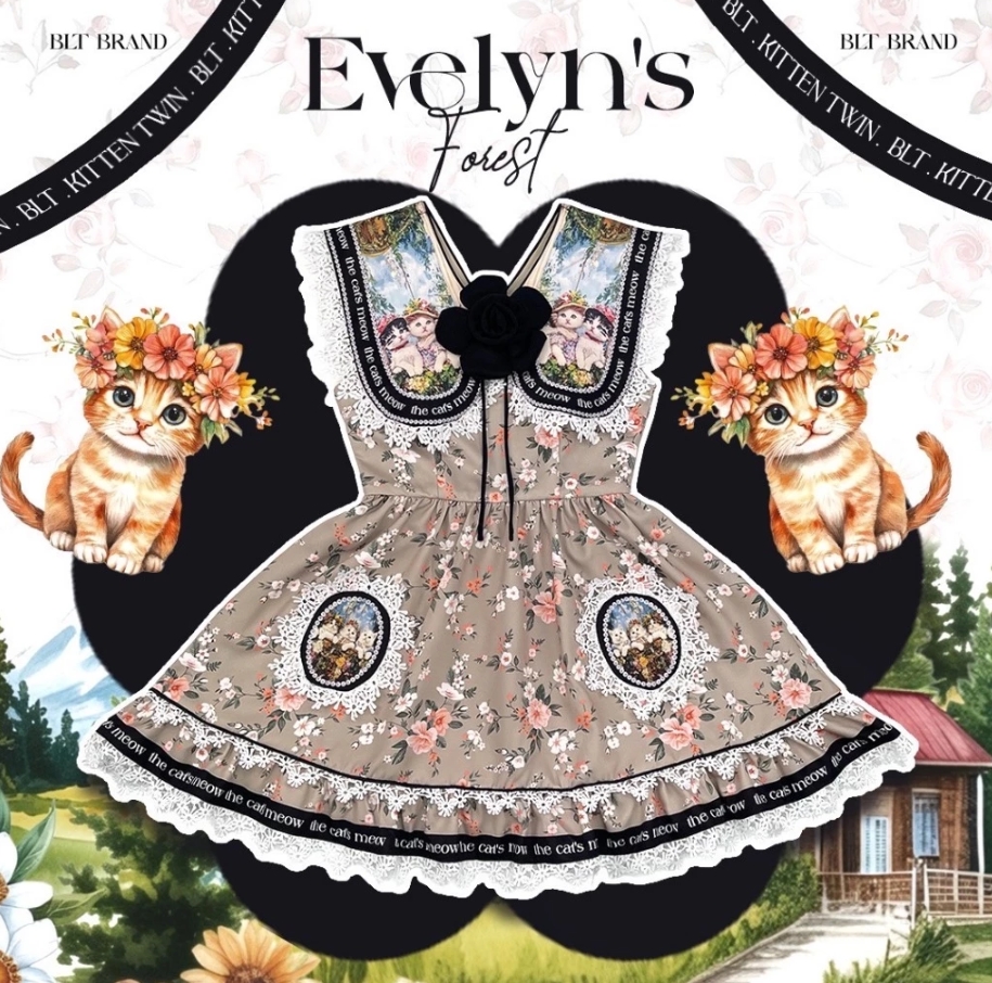 BLT BRAND มินิเดรสพิมพ์ลายวินเทจน้องแมว แต่งคอปกขอบลูกไม้+เข็มกลัดดอกไม้ ใส่เที่ยวคาเฟ่ ออกงาน