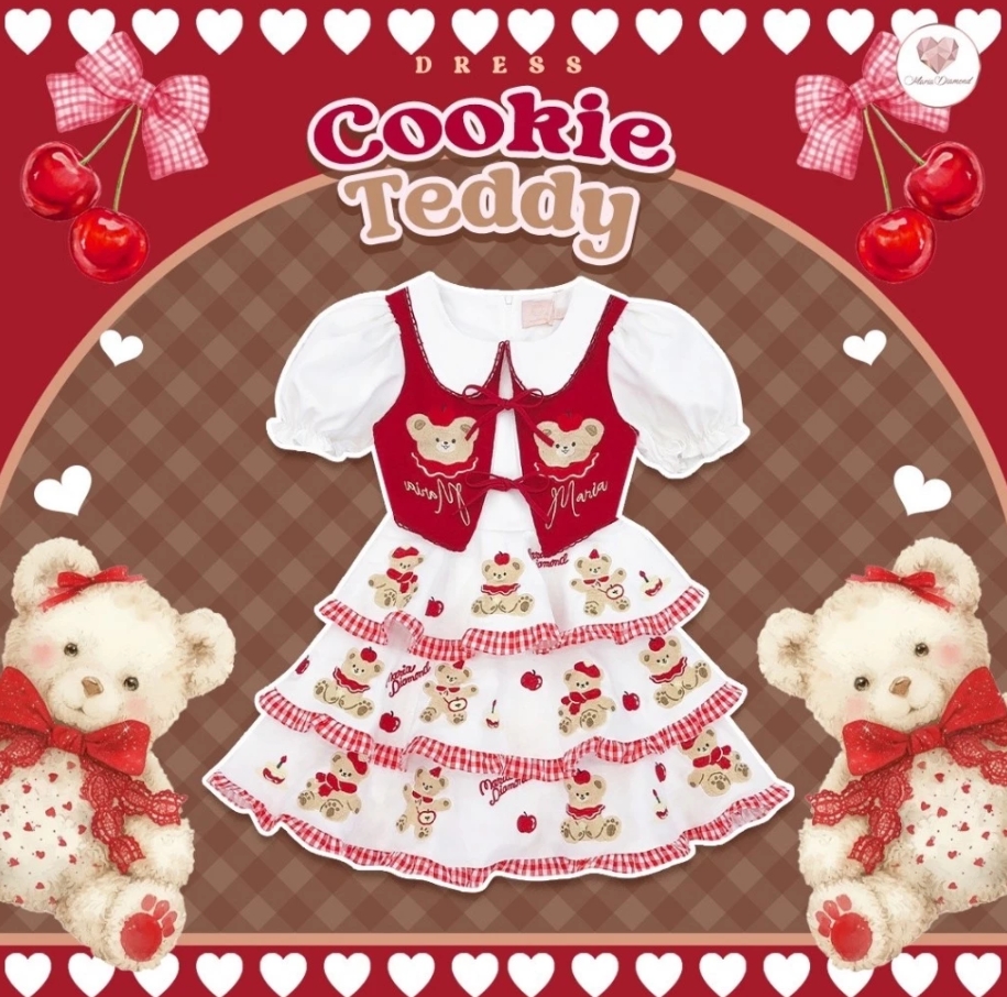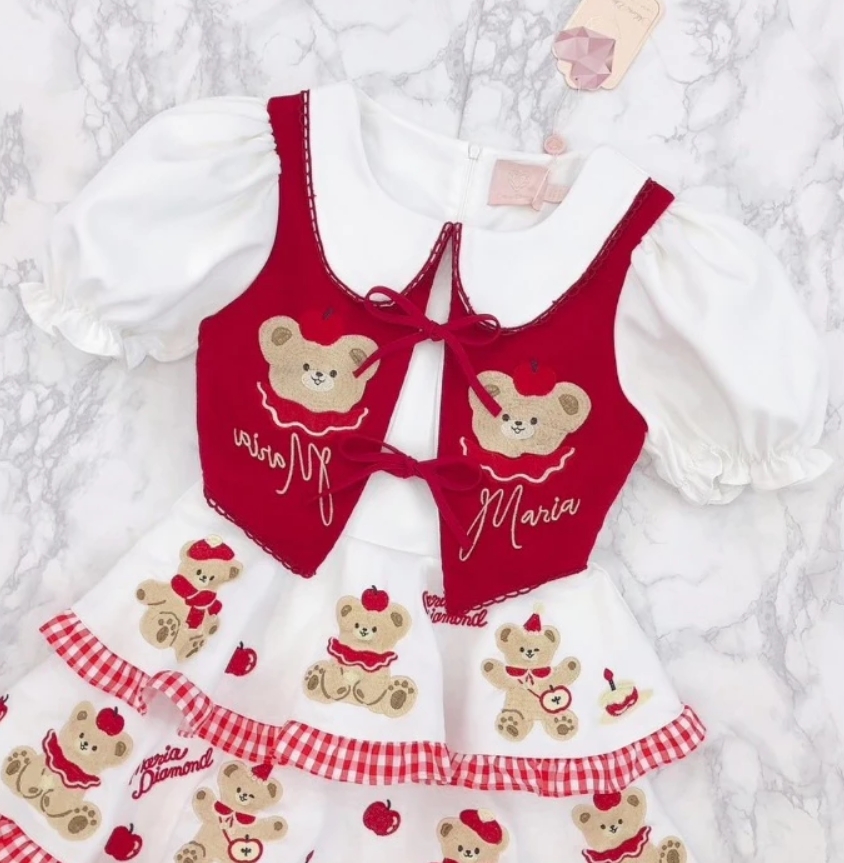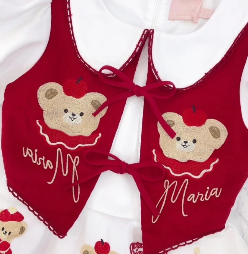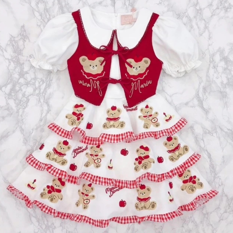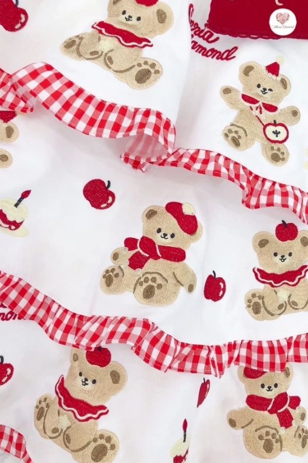Maria Diamond สีขาวแดง Cookie Teddy Dress เดรสผ้าเปเป้งานปักทั้งชุด ดีเทลเอี๊ยมผูกโบว์หน้า
